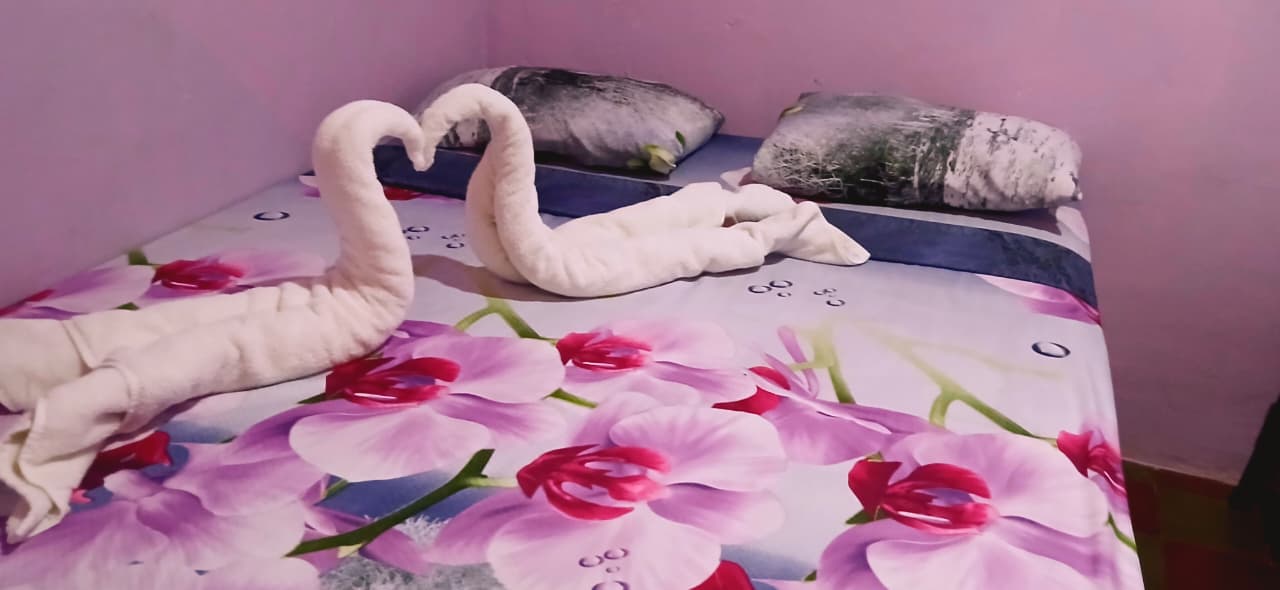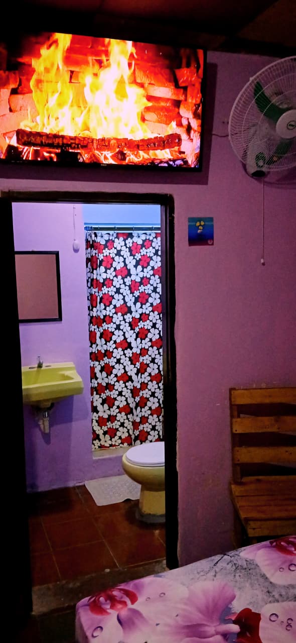 Cómoda Habitación Privada con una cama matrimonial, abanico y baño Privado dentro de la habitación.